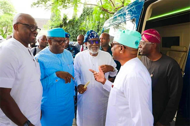 On Friday, three APC governors: Kayode Fayemi of Ekiti State who is also the Chairman of the Nigerian Governors’ Forum; Rotimi Akeredolu of Ondo State; and Babajide Sanwo-Olu of Lagos State; and a former governor of Ekiti State, Ayo Fayose, who is a PDP member, visited Wike in Port Harcourt, the Rivers State capital.